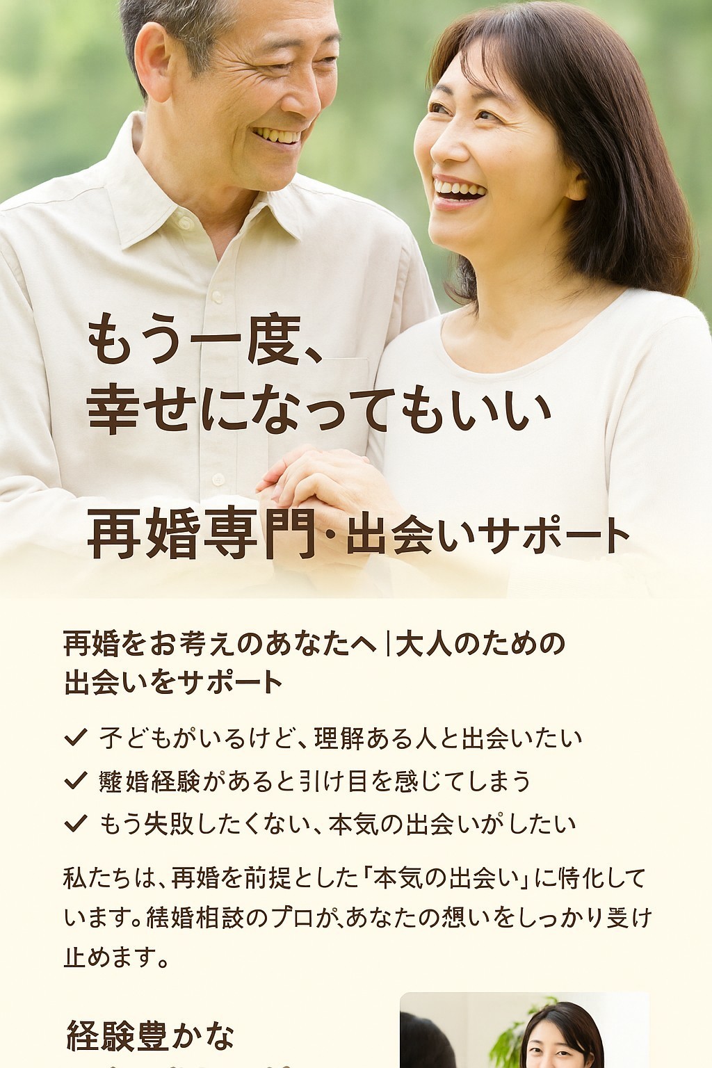 個人情報の管理も徹底。安心してご利用いただけます。私たちは、再婚を前提とした「本気の出会い」に特化して           います。